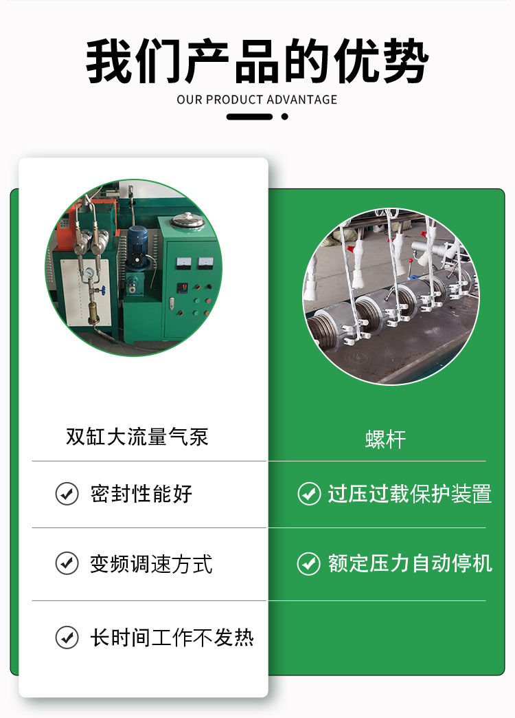 经本厂研制开发的双缸大流量气泵,采用变频调速方式,运行稳定,密封性能好。 柱塞直径有ф12-ф14等各种规格,可供多种发泡类机组配套使用,如发泡网、发泡布、发泡片材等等。
